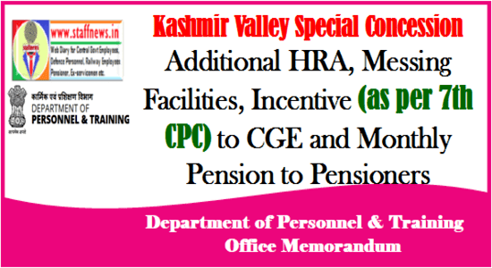 The undersigned is directed to refer to this Department’s O.M. no. 18016/3/ 2018-Estt.(L) dated 14.10.2020 on the subject mentioned above and to state that it has been decided by the competent authority to extend the package of concessions/ incentives to Central Government employees working in Kashmir Valley for a further period of three years with effect from 01.08.2021. The package for the period of three years with effect from 01.08.2021is as per Annexure.