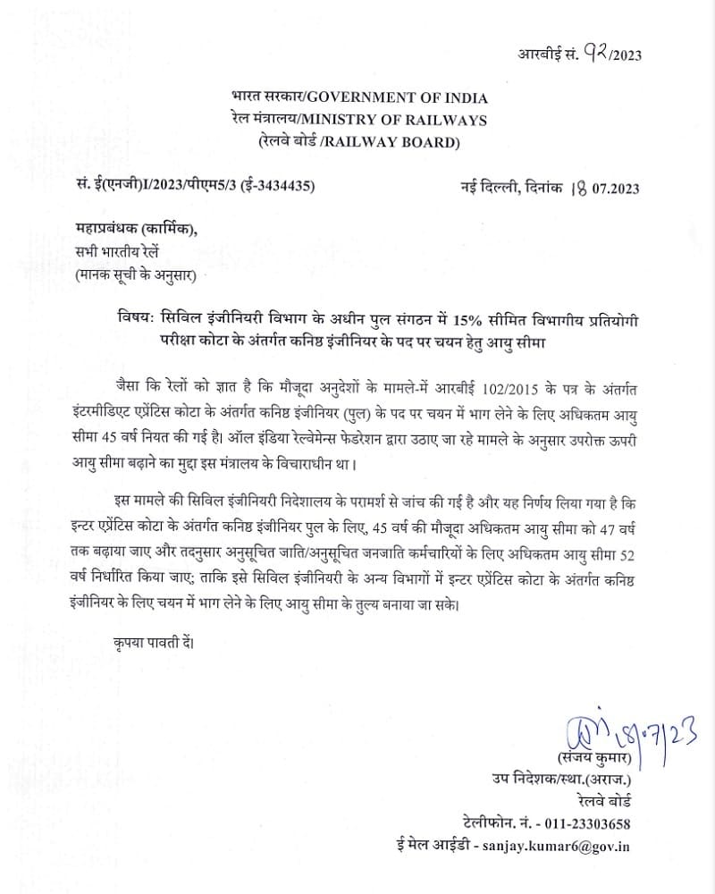 Age limit for selection to the post of J.E. against 15% LDCE Quota in Bridge Organisation under Civil Engineering Department: Railway Board Order RBE No. 92/2023 dated 18.07.2023