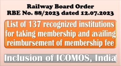 List of 137 recognized institutions for taking membership and availing reimbursement of membership fee – Inclusion of ICOMOS, India: Railway Board Order RBE No. 88/2023 dated 12.07.2023