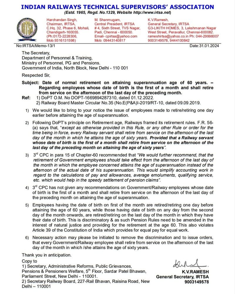 Date of normal retirement on attaining superannuation age of 60 years: Demand if born on the 1st, superannuation on their birth month’s last day. IRTSA writes to the Secretary of the Department of Personnel & Training highlights the issue of premature retirement, particularly affecting those born on the first of a month, requesting rectification for equal retirement standards.