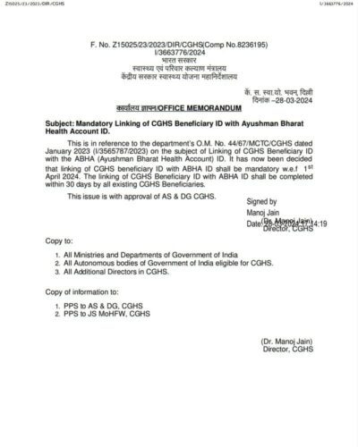 This is in reference to the department’s O.M. No. 44/67/MCTC/CGHS dated January 2023 (I/3565787/2023) on the subject of Linking of CGHS Beneficiary ID with the ABHA (Ayushman Bharat Health Account) ID. It has now been decided that linking of CGHS beneficiary ID with ABHA ID shall be mandatory w.e.f 1st April 2024. The linking of CGHS Beneficiary ID with ABHA ID shall be completed within 30 days by all existing CGHS Beneficiaries.
