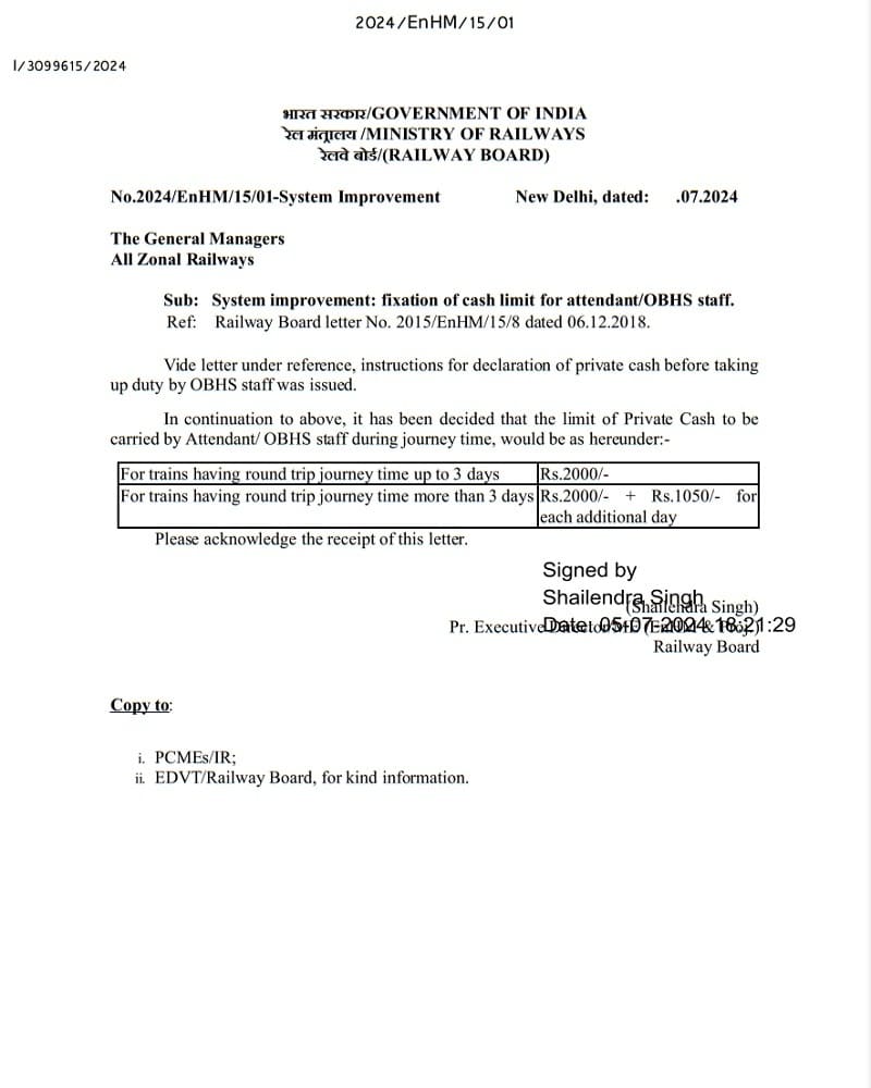 Fixation of cash limit for attendant/OBHS staff – System improvement: Railway Board Order dated 05.07.2024