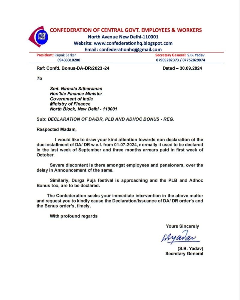 Declaration of DA/DR, PLB and Adhoc Bonus – Confederation writes to Smt. Nirmala Sitharaman, Finance Minister for immediate intervention