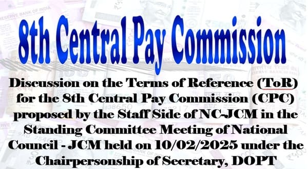 Terms of Reference (ToR) for the 8th Central Pay Commission – Brief of discussion between Secretary, DoPT and Staff Side of NC(JCM) issued by Secretary, National Council (Staff Side), Joint Consultative Machinery on 10.02.2025