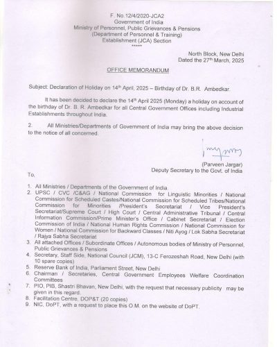 Declaration of Holiday on 14th April, 2025 — Birthday of Dr. B.R. Ambedkar: DoP&T O.M. dated 27.03.2025