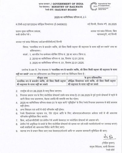 Commercial Circular No. 06 of 2025 – Replacement of Word “Mentally retarded persons who cannot travel without an escort”: Railway Board Order dated 09.05.2025