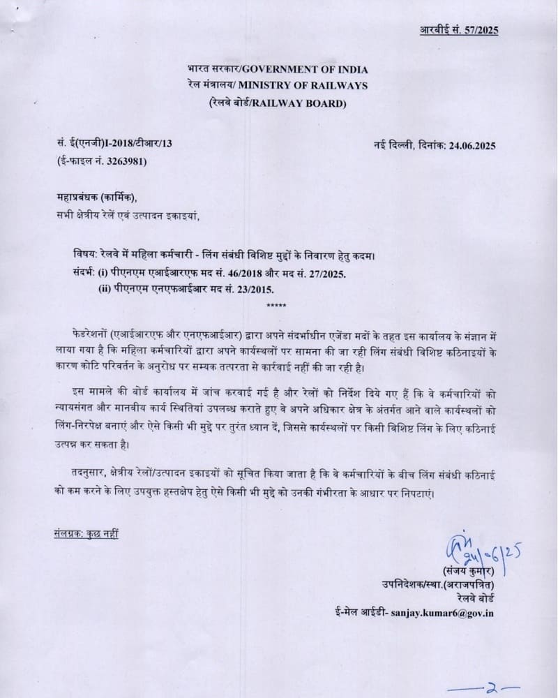 Female employees in Railways – Step to redress gender specific issues: Railway Board Order RBE No. 57/2025 dated 24.06.2025
