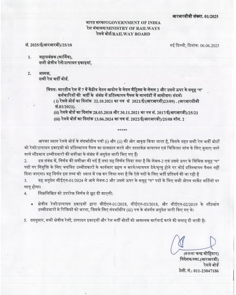 Recruitment of Group C staff in Level—2 and above of 7th CPC Pay Matrix on Indian Railways – modifications of criteria of replacement panel: Railway Board Order RRCB No. 91/2025 dated 06.06.2025
