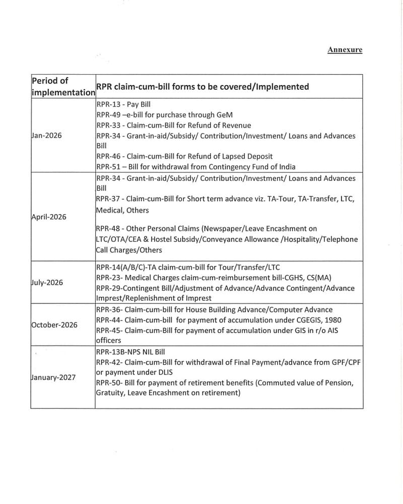 2. The ebill system has been implemented by O/o CGA across various PAOs in Civil Ministries/Departments. In order to universalize the implementation of e-bill, the claim-cum-bill forms as prescribed in Subsidiary Instructions to CGA(R&P) Rules, 2022 have been developed in PFMS. The implementation plan for the e-Bill system, effective from January 2026 in e-Bill-enabled PAOs/NCDDOs, is enclosed as Annexure.