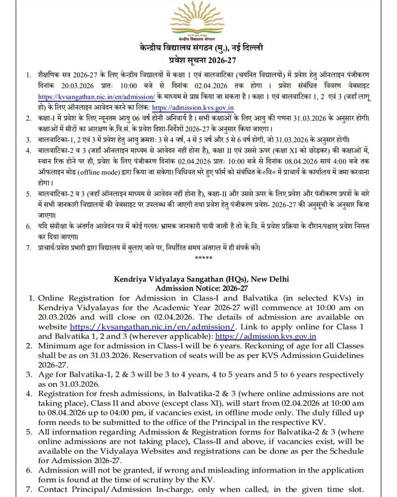 - Online Registration for Admission in Class-I and Balvatika (in selected KVs) in Kendriya Vidyalayas for the Academic Year 2026-27 will commence at 10:00 am on 20.03.2026 and will close on 02.04.2026. The details of admission are available on website https://kvsangathan.nic.in/en/admission/. Link to apply online for Class 1 and Balvatika 1, 2 and 3 (wherever applicable): https://admission.kvs.gov.in.